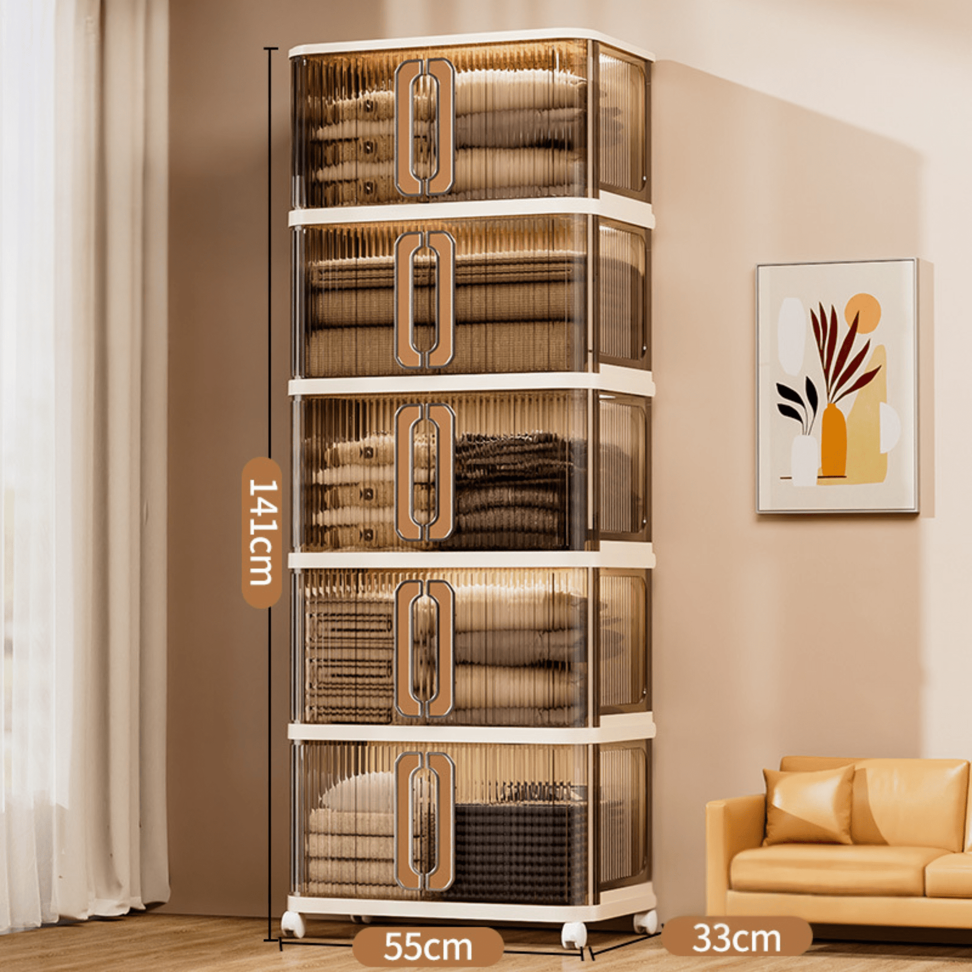 Provides ample storage space with a flexible, multi-layered structure. Each layer can be stacked or adjusted to fit different storage needs, making it ideal for various rooms.
